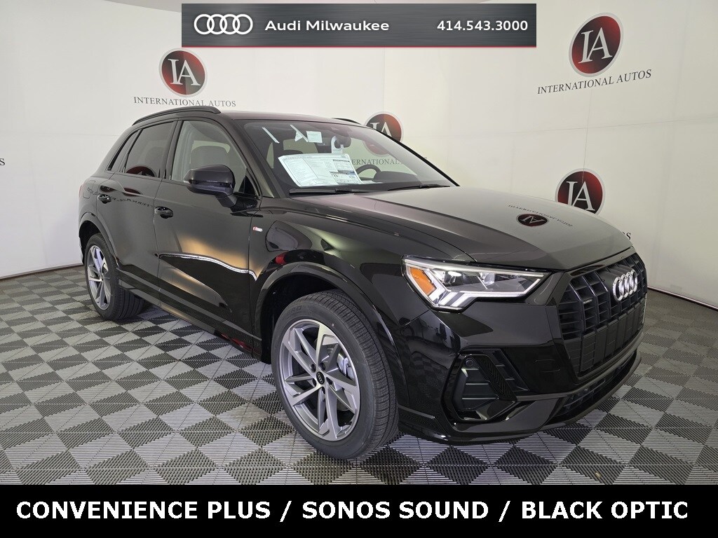 Mythos Black Metallic 2025 Audi Q3 Premium S Line quattro quattro 8-Speed Automatic with Tiptronic 2.0L 4-Cylinder TFSI 10 Speakers, ABS brakes, Alarm w/Motion Sensor, Alloy wheels, Audi Beam-Rings, Audi Guard Protection Kit, Auto High-beam Headlights, Auto-Dimming Power-Folding Exterior Mirrors, Auto-Dimming Rear-View Mirror, Automatic temperature control, Black Exterior Trim, Black Roof Rails, Convenience Plus Package, Driver Seat Memory, Exterior Parking Camera Rear, Garage Door Opener (HomeLink), Heated Front Bucket Seats, Illuminated entry, Leather Seating Surfaces, Leather steering wheel, LED Interior Lighting Package, Panic alarm, Power driver seat, Power Liftgate, Power moonroof: Panoramic, Rain sensing wipers, SONOS Premium Sound System w/3D Sound, Speed control, Telescoping steering wheel, Tilt steering wheel, Wheels: 19" 5-Arm-Trapezoid Bicolor Finish, Wireless Phone Charging Pad.