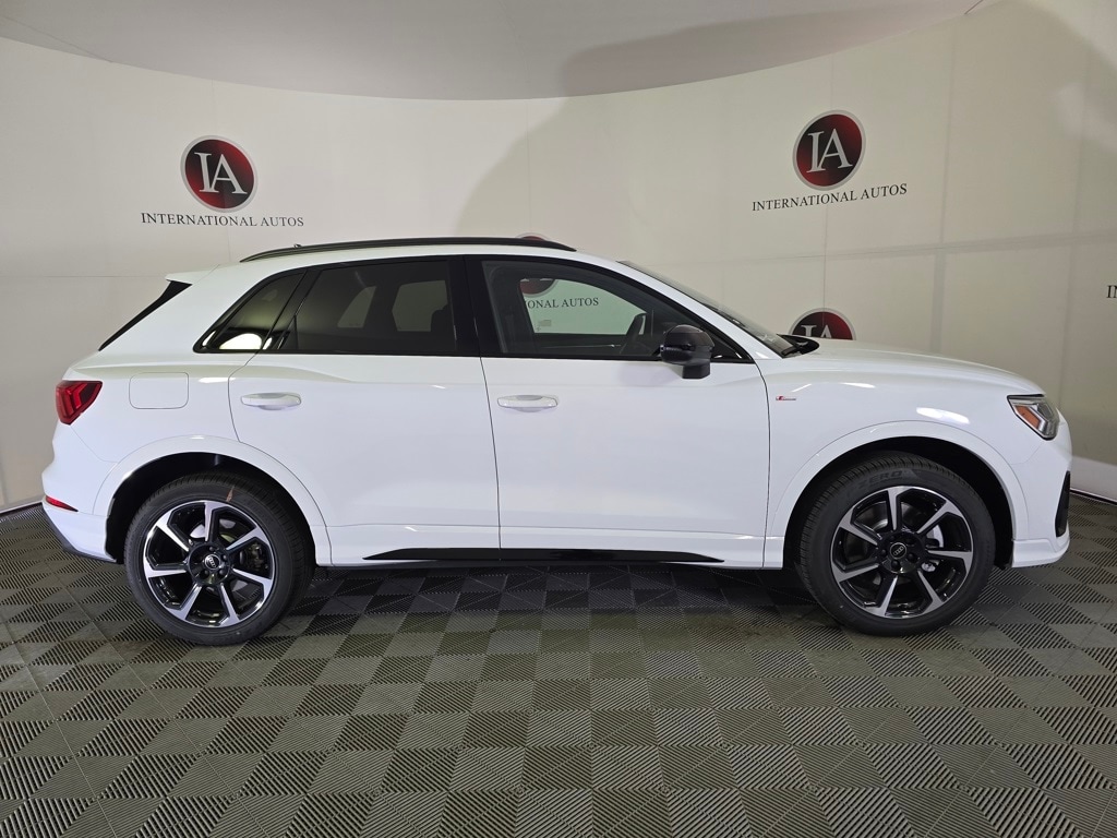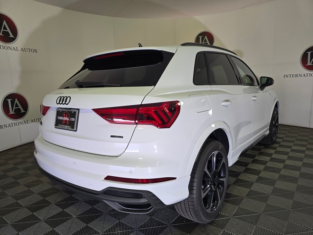 Glacier White Metallic 2025 Audi Q3 Premium Plus S Line quattro quattro 8-Speed Automatic with Tiptronic 2.0L 4-Cylinder TFSI 10 Speakers, ABS brakes, Alarm w/Motion Sensor, Alloy wheels, Audi Advanced Key, Audi smartphone interface (Apple CarPlay/Android Auto), Auto High-beam Headlights, Auto-Dimming Power-Folding Exterior Mirrors, Auto-Dimming Rear-View Mirror, Automatic temperature control, Black Exterior Mirrors, Black Exterior Trim & Badges, Black Optic Plus Package, Black Roof Rails, Carbon Inlays, Convenience Package, Driver Seat Memory, Exterior Parking Camera Rear, Garage Door Opener (HomeLink), Heated Front Bucket Seats, Leather Seating Surfaces, Leather steering wheel, LED Interior Lighting Package, LED Interior Lighting Plus Package, Outside temperature display, Panic alarm, Power Liftgate, Power moonroof: Panoramic, Premium Plus Package, Rain sensing wipers, SiriusXM, SONOS Premium Sound System w/3D Sound, Speed control, Sport Front Bucket Seats w/S Embossing, Stainless Steel Pedal Caps, Top View Camera System, Traction control, Wheels: 19" 7-Spoke-Rotor-Design, Wireless Phone Charging Pad.