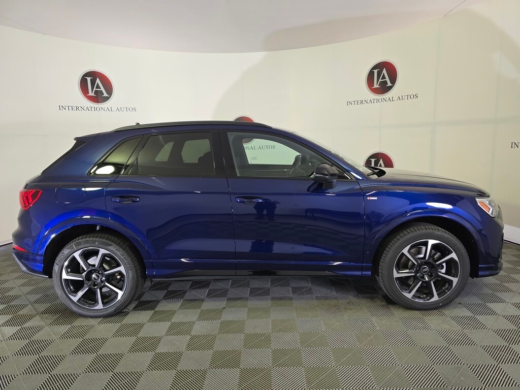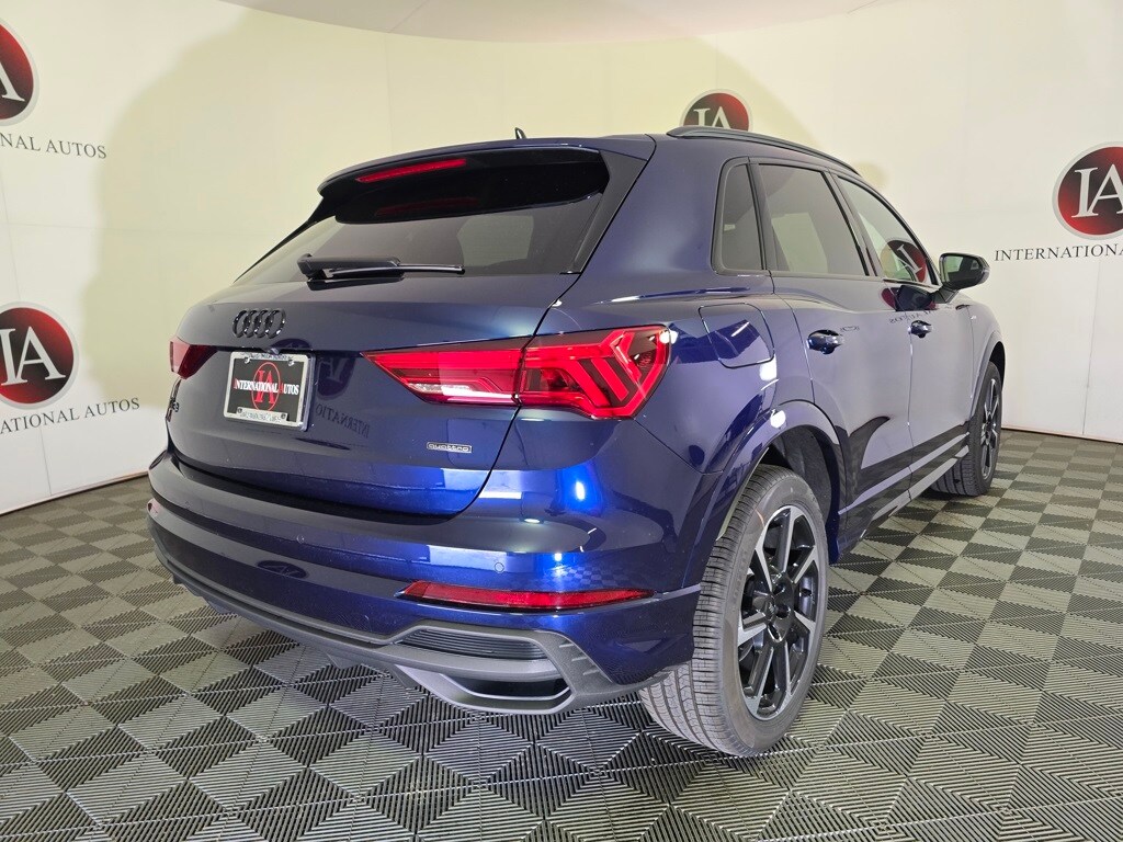Navarra Blue Metallic 2025 Audi Q3 Premium Plus S Line quattro quattro 8-Speed Automatic with Tiptronic 2.0L 4-Cylinder TFSI ABS brakes, Alarm w/Motion Sensor, Alloy wheels, Audi Advanced Key, Audi smartphone interface (Apple CarPlay/Android Auto), Auto High-beam Headlights, Auto-Dimming Power-Folding Exterior Mirrors, Auto-Dimming Rear-View Mirror, Automatic temperature control, Black Exterior Mirrors, Black Exterior Trim & Badges, Black Optic Plus Package, Black Roof Rails, Carbon Inlays, Convenience Package, Driver Seat Memory, Exterior Parking Camera Rear, Garage Door Opener (HomeLink), Heated Front Bucket Seats, Leather Seating Surfaces, Leather steering wheel, LED Interior Lighting Package, LED Interior Lighting Plus Package, Panic alarm, Power Liftgate, Power moonroof: Panoramic, Premium Plus Package, Rain sensing wipers, SiriusXM, SONOS Premium Sound System w/3D Sound, Speed control, Spoiler, Sport Front Bucket Seats w/S Embossing, Stainless Steel Pedal Caps, Top View Camera System, Wheels: 19" 7-Spoke-Rotor-Design, Wireless Phone Charging Pad.
