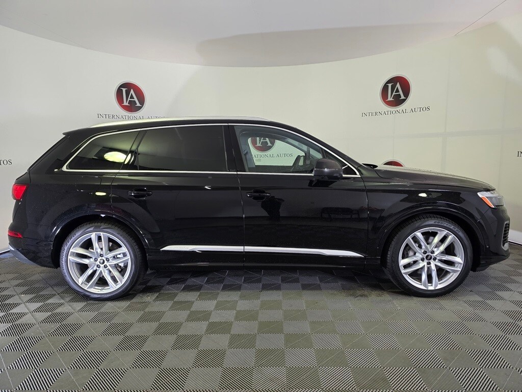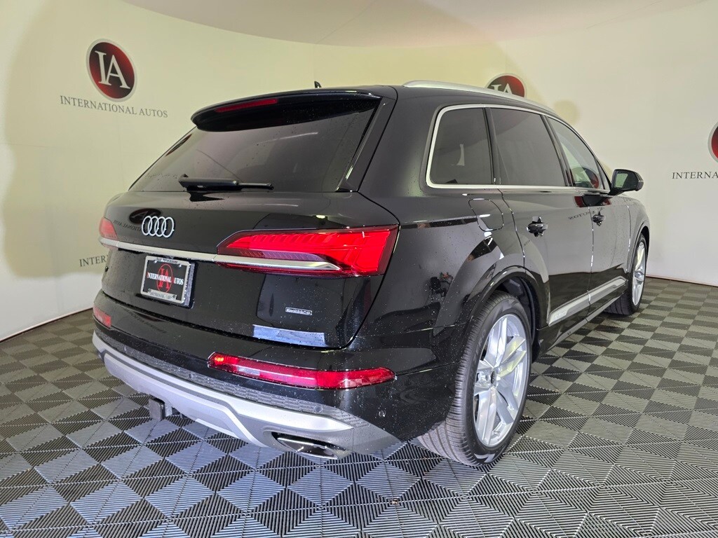 Mythos Black Metallic 2025 Audi Q7 55 Premium Plus quattro quattro 8-Speed Automatic with Tiptronic 3.0L TFSI 3rd row seats: bench, 7-Pin Adapter, ABS brakes, Active Cruise Control, Alloy wheels, Auto High-beam Headlights, Auto-dimming door mirrors, Auto-dimming Rear-View mirror, Bang & Olufsen Premium Sound System w/3D Sound, Comfort Adaptive Air Suspension, Control Buttons in Gloss Black w/Haptic Feedback, Convenience Package, Dual-Pane Acoustic Glass for Side Windows, Executive Plus Package, Exterior Parking Camera Rear, Four-Zone Automatic Climate Control, Front Seats w/Ventilation, Heated Front Bucket Seats, Heated Rear Seats, Heated Steering Wheel, Illuminated Door Sills, Leather Seating Surfaces, Leather steering wheel, LED Interior Lighting Package Plus, Memory seat, Navigation system: Audi MMI Navigation plus with Touch Response, Outside temperature display, Power Liftgate, Power moonroof: Panoramic, Power Soft-Closing Doors, Premium Plus Package, Rain sensing wipers, Rear Door/Side Windows & Tailgate Sunshades, Top View Camera System, Traffic Sign Recognition, Trailer Hitch, Wheels: 21" 5-Double-Spoke Design, Wireless Phone Charging Pad.