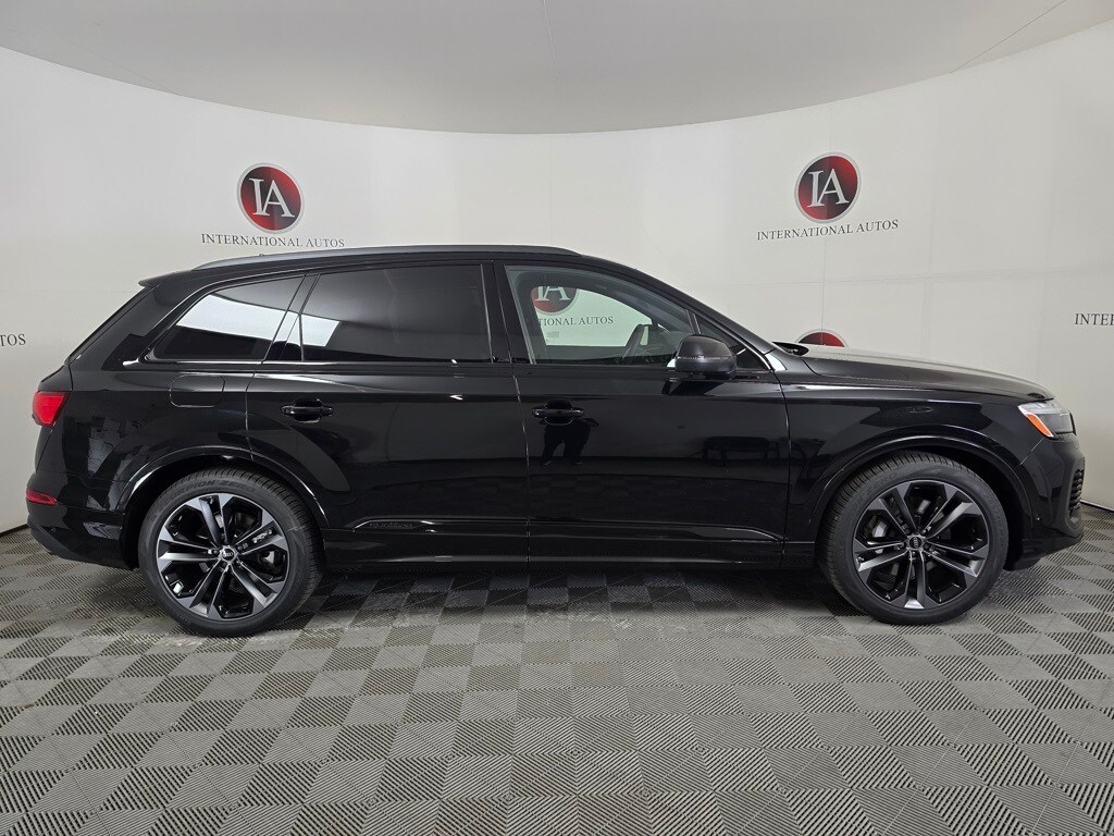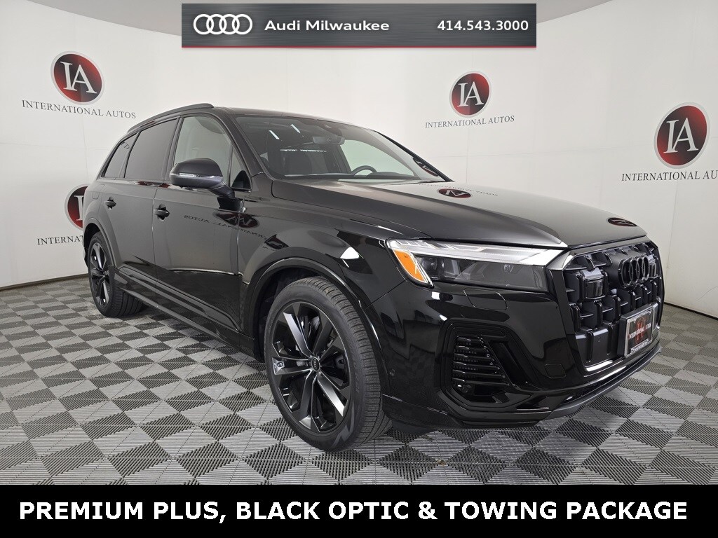 Mythos Black Metallic 2026 Audi Q7 55 Premium Plus quattro quattro 8-Speed Automatic with Tiptronic 3.0L TFSI 3rd row seats: bench, 4-Way Power Lumbar For Passenger Seat, 7-Pin Adapter, 7700 lbs Towing Capacity, Active Cruise Control, Adaptive Air Suspension, Anthracite Gray Audi Rings, Auto High-beam Headlights, Auto-dimming Rear-View mirror, Bang & Olufsen Premium Sound System with 3D Sound, Black Door Blades, Black Exterior Trim, Black Grille, Black Optic Package, Black Roof Rails, Black Wheel Center Caps, Black Window Surrounds, Control Buttons in Gloss Black with Haptic Feedback, Dark Chrome Exhaust Tips, Dual-Pane Acoustic Glass For Side Windows, Exterior Parking Camera Rear, Four-Zone Automatic Climate Control, Heated Front Bucket Seats, Heated Rear Seats, Heated Steering Wheel, Illuminated Door Sills, Leather Seating Surfaces, LED Interior Lighting Plus Package, Memory seat, Navigation system: Audi MMI Navigation plus with Touch Response, Power Liftgate, Power moonroof: Panoramic, Power Soft-Closing Doors, Premium Plus Package, Rain sensing wipers, Rear Door/Side Windows and Tailgate Sunshades, Top View Camera System with Virtual 360 View, Trailer Hitch, Ventilation For Front Seats, Wheels: 21" 5-Double-Spoke-Module-Design with Matte Gray Finish.