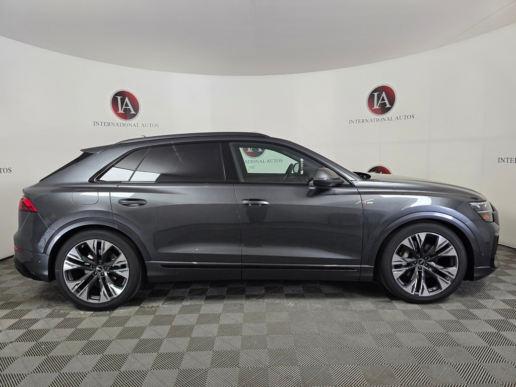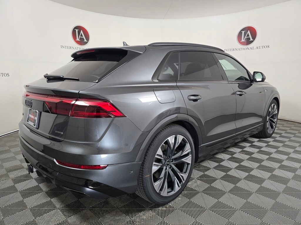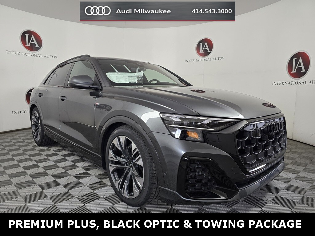 Daytona Gray Pearl Effect 2026 Audi Q8 55 Premium Plus quattro quattro 8-Speed Automatic with Tiptronic 3.0L TFSI 4-Way Power Lumbar For Passenger Seat, 4-Zone Automatic Climate Control, 7-Pin Adapter, ABS brakes, Active Cruise Control, Adaptive Air Suspension, Alloy wheels, Anthracite Gray Audi Rings, Auto High-beam Headlights, Bang & Olufsen Premium Sound System with 3D Sound, Black Exterior Trim, Compass, Control Buttons in Gloss Black with Haptic Feedback, Dark Chrome Exhaust Tips, Dual-Pane Acoustic Glass For Side Windows, Electronic Stability Control, Exterior Parking Camera Rear, Front dual zone A/C, Front Seats with Ventilation, Heated door mirrors, Heated Front Bucket Seats, Heated front seats, Heated Rear Seats, Heated Steering Wheel, Illuminated Door Sills, Illuminated entry, Illuminated S Line Door Sills, Leather Seating Surfaces, LED Interior Lighting Plus Package, Low tire pressure warning, Memory seat, Navigation System, Navigation system: Audi MMI Navigation plus with Touch Response, Outside temperature display, Power Liftgate, Power moonroof: Panoramic, Power Rear Side Windows with Manual Tailgate Sunshades, Power Soft-Closing Doors, Premium Plus Package, Rain sensing wipers, Remote keyless entry, S Line Black Optic Package, S Line Exterior, Top View Camera System with Virtual 360 View, Traction control, Trailer Hitch, Wheels: 22" 5-Double-Arm Design with Bicolor Finish.