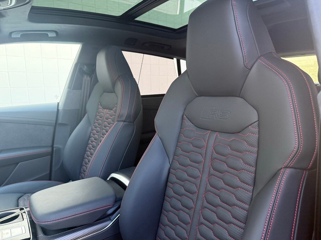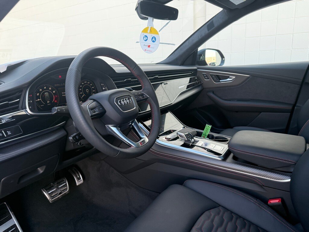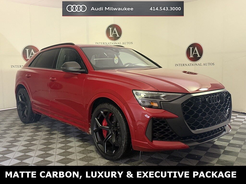 Chili Red Metallic 2026 Audi RS Q8 performance 4.0T quattro quattro 8-Speed Automatic with Tiptronic 4.0L V8 Turbocharged DOHC 32V LEV3-ULEV125 631hp 7-Pin Adapter, Adaptive suspension, All-Weather Floor Mats, Anthracite Gray Audi Rings, Auto High-beam Headlights, Automatic temperature control, Black Dinamica Headliner, Black Exterior Trim, Black Wheel Center Caps, Dual-Pane Acoustic Glass For Side Windows, Executive Package, Exterior Parking Camera Rear, Head-Up Display, Heated and Ventilated Front Sport Seats Plus, Heated front seats, Heated Rear Seats, Heated steering wheel, Interior Protection Package, Intersection Assist, Luxury Package, Massage Function For Front Seats, Matte Carbon Inlay Between Taillights, Matte Carbon Mask and Front Bumper Inlays, Matte Carbon Mirror Housings, Matte Carbon Package, Matte Carbon Trim Around Exhaust Tips, Memory seat, Navigation system: Audi MMI Navigation plus with Touch Response, Power Liftgate, Power moonroof: Panoramic, Power Soft-Closing Doors, Rain sensing wipers, Rear Window Blind, Remote Park Assist Plus, RS Sport Exhaust System, Trailer Hitch, Valcona Leather Seating Surfaces, Ventilated front seats, Wheels: 23" 5-Y-Spoke Design with Matte Black Finish.