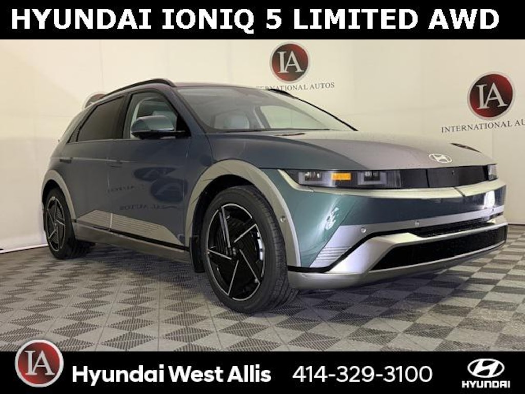 IONIQ 5 Limited AWD, 4D Sport Utility, Electric Motor, 1-Speed Automatic, AWD, Digital Teal, Dark Green w/H-Tex Artificial Leather Seating Surfaces, 4-Wheel Disc Brakes, 8 Speakers, ABS brakes, Air Conditioning, All Season Fitted Liners, Alloy wheels, AM/FM radio: SiriusXM, Apple CarPlay & Android Auto, Auto High-beam Headlights, Auto-dimming Rear-View mirror, Automatic temperature control, Bodyside moldings, Brake assist, Bumpers: body-color, Cargo Net, Carpeted Floor Mats, Delay-off headlights, Driver door bin, Driver vanity mirror, Dual front impact airbags, Dual front side impact airbags, Electronic Stability Control, Emergency communication system: None, First Aid Kit, Four wheel independent suspension, Front anti-roll bar, Front Bucket Seats, Front Center Armrest w/Storage, Front dual zone A/C, Front reading lights, Fully automatic headlights, Garage door transmitter: HomeLink, H-Tex Artificial Leather Seating Surfaces, Heads-Up Display, Heated and Ventilated Front Bucket Seats, Heated door mirrors, Heated front seats, Heated rear seats, Heated steering wheel, Illuminated entry, Low tire pressure warning, Memory seat, Mudguards, Navigation System, Occupant sensing airbag, Option Group 01, Outside temperature display, Overhead airbag, Overhead console, Panic alarm, Passenger door bin, Passenger vanity mirror, Power door mirrors, Power driver seat, Power Liftgate, Power passenger seat, Power steering, Power windows, Radio: AM/FM/SiriusXM/HD Audio System, Rain sensing wipers, Rear anti-roll bar, Rear reading lights, Rear seat center armrest, Rear side impact airbag, Rear window defroster, Rear window wiper, Remote keyless entry, Security system, Speed control, Speed-sensing steering, Split folding rear seat, Spoiler, Steering wheel mounted audio controls, Telescoping steering wheel, Tilt steering wheel, Traction control, Trip computer, Turn signal indicator mirrors, Up Seatback Cargo Mat, Variably intermittent wipers, Ventilated front seats, Wheels: 20" x 8.5J Alloy, IONIQ 5 Limited AWD, 4D Sport Utility, Electric Motor, 1-Speed Automatic, AWD, Digital Teal, Dark Green w/H-Tex Artificial Leather Seating Surfaces.