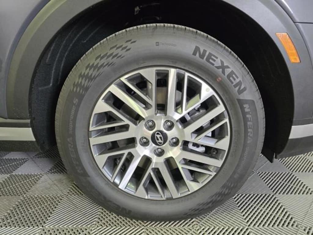 3rd row seats: split-bench, 4-Wheel Disc Brakes, 8 Speakers, ABS brakes, Air Conditioning, All-Season Fitted Liners, Alloy wheels, AM/FM radio: SiriusXM, Apple CarPlay & Android Auto, Auto High-beam Headlights, Auto-dimming Rear-View mirror, Auto-leveling suspension, Automatic temperature control, Brake assist, Bumpers: body-color, Cargo Net, Cargo Tray, Carpeted Floor Mats, Compass, Delay-off headlights, Driver door bin, Driver vanity mirror, Dual front impact airbags, Dual front side impact airbags, Electronic Stability Control, Emergency communication system: Bluelink+, Exterior Parking Camera Rear, First Aid Kit, Four wheel independent suspension, Front anti-roll bar, Front Bucket Seats, Front Center Armrest, Front dual zone A/C, Front reading lights, Fully automatic headlights, H-Tex Leatherette Seat Trim, Heated door mirrors, Heated Front Bucket Seats, Heated front seats, Illuminated entry, Knee airbag, Leather steering wheel, Low tire pressure warning, Mud Guards, Navigation System, Occupant sensing airbag, Option Group 01, Outside temperature display, Overhead airbag, Overhead console, Panic alarm, Passenger door bin, Passenger vanity mirror, Power door mirrors, Power driver seat, Power Liftgate, Power moonroof, Power passenger seat, Power steering, Power windows, Radio data system, Radio: Infotainment Navigation System, Rear air conditioning, Rear anti-roll bar, Rear audio controls, Rear reading lights, Rear side impact airbag, Rear window defroster, Rear window wiper, Reclining 3rd row seat, Remote keyless entry, Roadside Assistance Kit, Security system, Speed control, Split folding rear seat, Spoiler, Steering wheel mounted audio controls, Tachometer, Telescoping steering wheel, Tilt steering wheel, Traction control, Trip computer, Turn signal indicator mirrors, Variably intermittent wipers, Wheels: 18" x 8.0J Alloy.