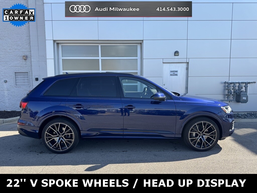 CARFAX One-Owner. Navarra Blue Metallic 2021 Audi Q7 55 Prestige quattro quattro 8-Speed Automatic with Tiptronic 3.0L TFSI V6 DOHC 3rd row seats: bench, 4-Zone Automatic Climate Control, Alloy wheels, Audi Adaptive Cruise Assist w/Traffic Jam Assist, Audi Phone Box w/Wireless Charging, Audi smartphone interface (Apple CarPlay/Android Auto), Auto High-beam Headlights, Bang & Olufsen 3D Premium Sound System, Black Optic Exterior Package, Black Optic Package, Black Window Surrounds, Comfort Adaptive Air Suspension, Compass, Contour/Ambient LED Interior Lighting Package, Convenience Package, Dual-Pane Acoustic Side Windows, Executive Package, Exterior Parking Camera Rear, Head-Up Display, Heated Front Bucket Seats, Heated Rear Seats, Illuminated Door Sills, Intersection Assist, Leather Seating Surfaces, Matrix-Design LED Headlights, Memory seat, Navigation system: Audi MMI Navigation plus with Touch Response, Outside temperature display, Overhead console, Power Liftgate, Power moonroof, Power Soft-Closing Doors, Prestige Package, Rain sensing wipers, Rear Door/Side Windows & Tailgate Sunshades, Reclining 3rd row seat, Security system, Topview Camera System, Tow Hitch Receiver, Towing Package, Traffic Sign Recognition, Wheels: 22" Audi Sport 5-V-Spoke Star Design.