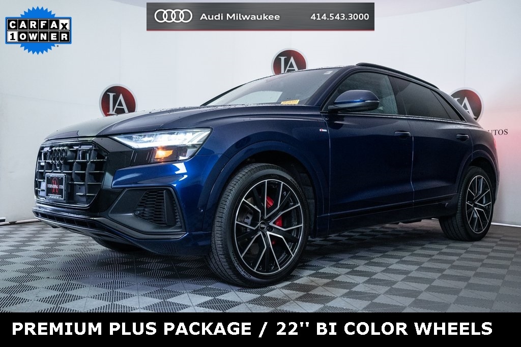 CARFAX One-Owner. Navarra Blue Metallic 4D Sport Utility 2021 Audi Q8 55 Premium Plus quattro quattro 8-Speed Automatic with Tiptronic 3.0L V6 Turbocharged DOHC 24V LEV3-ULEV70 335hp