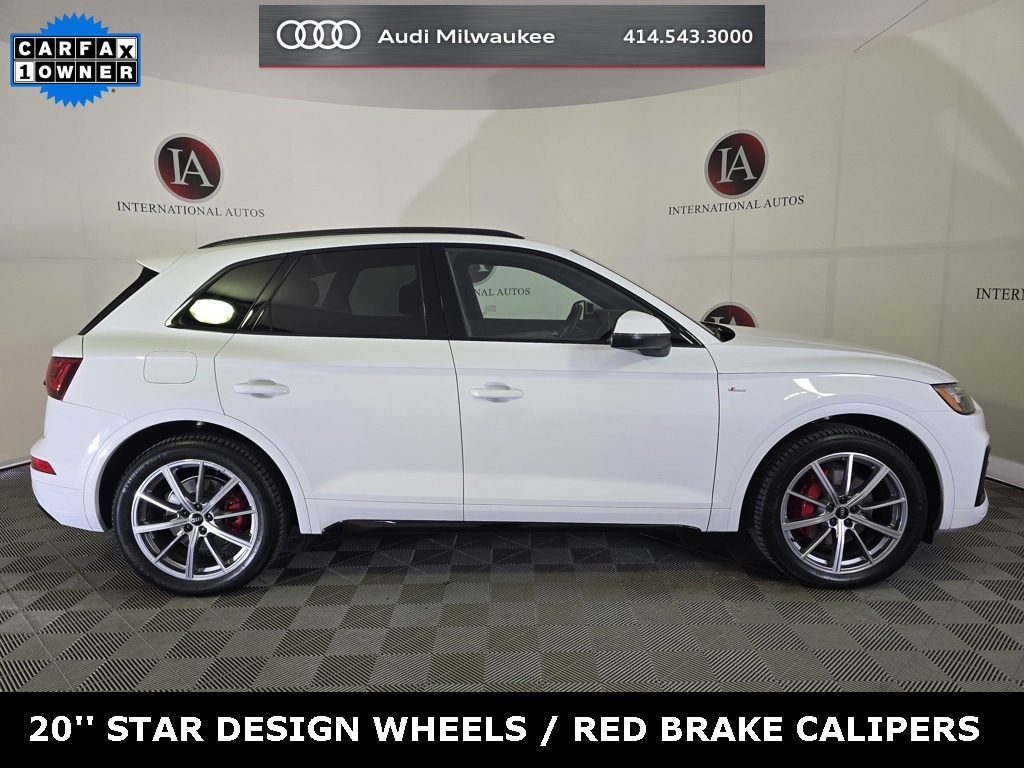 New Price! CARFAX One-Owner. Glacier White Metallic 2024 Audi Q5 e 55 Premium Plus S Line quattro 7-Speed Automatic S tronic 2.0L Turbocharged ABS brakes, Active Cruise Control, Adaptive Air Suspension, Alloy wheels, Audi Advanced Key, Audi Beam-Rings, Auto High-beam Headlights, Bang & Olufsen Sound System w/3D Sound, Black Audi Rings & Model Badge, Black Exterior Trim, Black Headliner, Black Optic Plus Package, Black Roof Rails, Brushed Aluminum Inlays, Compass, Convenience Package, Deluxe Pre-Entry Climate Control, Driver Seat Memory, Electronic Stability Control, Exterior Parking Camera Rear, Front dual zone A/C, Heated 8-Way Power Front Seats, Heated door mirrors, Heated front seats, Heated steering wheel, High-Gloss Rear Diffusor/Front Spoiler/Air Intakes, Illuminated entry, Leather/Dinamica Seats, Low tire pressure warning, Outside temperature display, Panoramic Sunroof, Perforated Leather Steering Wheel w/S Badge, Power Adjustable Steering Column, Power Liftgate, Premium Plus Package, Rain sensing wipers, Red Brake Calipers, Remote keyless entry, Security system, Sport Plus Package for Premium Plus, Top View Camera System, Traction control, Trailer Hitch, Wheels: 20" 10-Spoke-Star Design, Platinum Finish.